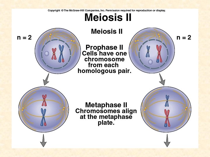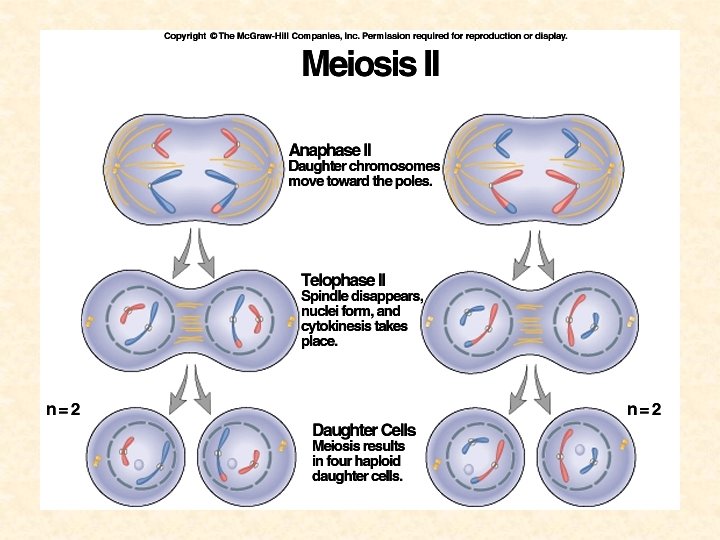 • Prophase II • Metaphase II • Anaphase II • Telophase II • Cytokinesis • Results in 4 haploid cells that will eventually form gametes