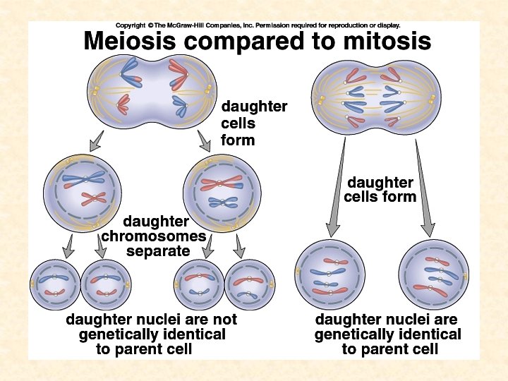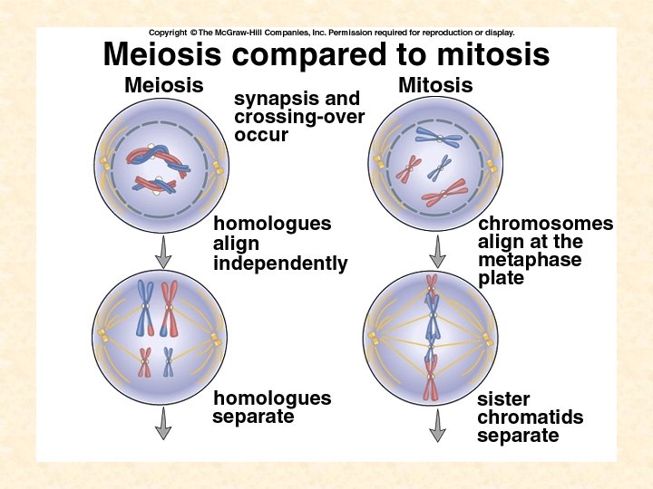 Comparison of Mitosis and Meiosis: Mitosis One Division Homologous Chromosomes line up independent of each at Metaphase Two daughter cells per cycle Daughter cells genetically identical Same Chromosome no. as parents Occurs in somatic cells throughout life cycle Used in growth, repair, asexual reproduction Meiosis Two divisions Homologous Chromosomes synapse at Metaphase 1 Four daughter cells per cycle Daughter cells genetically different Chromosome no. half that of parents Occurs in germ-line cells Completed after sexual maturity Sexual reproduction, new gene combinations.