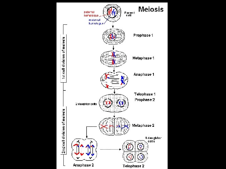 Meiosis I • Stage names are the same as mitosis • Divides Homologous chromosomes • Result is 2 cells with 2 identical copies of each chromosomes Meiosis II • Second half of meiosis that results in 4 haploid cells • Divides sister chromatids