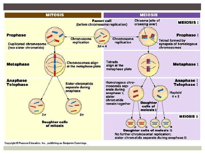 MITOSIS VS. MEIOSIS Mitosis Meiosis Parent diploid daughter cells Parent diploid haploid daughter cells 1 division 2 divisions Genetically Identical daughter cells Genetically different daughter cells Anaphase separates sister chromatids Anaphase I separates homologous chromosomes. Anaphase II separates sister chromatids No crossing over Crossing over 2 daughter cells 4 gametes/daughter cells
