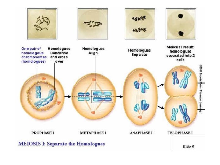 Section 1 Sexual Reproduction and Genetics Meiosis I § Anaphase I § Homologous chromosomes separate and move to opposite poles of the cell. Contrasts mitosis – chromosomes appear as individuals instead of pairs (meiosis) Anaphase I