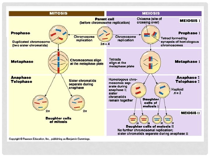 Meiosis Number of divisions Number of cells formed? Type of cells formed (haploid/diploid) Where does it occur? Why does it happen? Mitosis