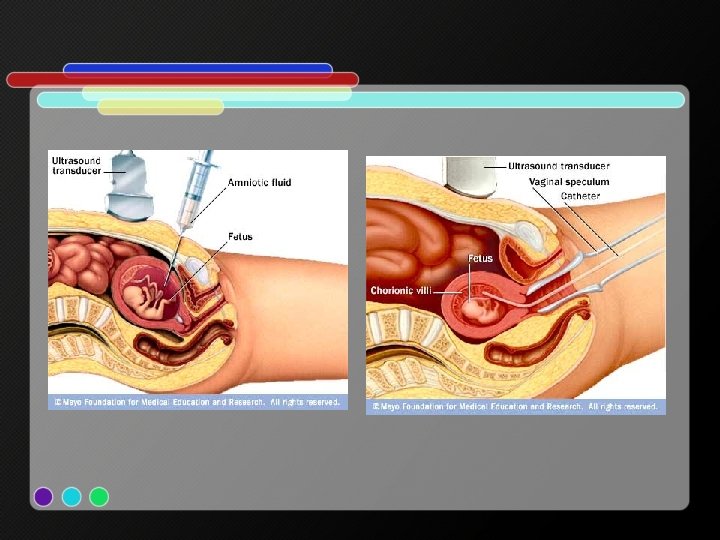 Obtaining cells for karyotyping • Amniocentesis – Hypodermic needle used to extract amniotic fluid around developing baby • Removing from chorionic villus – Obtained from tissue sample from the placenta’s projections into the uterine wall • White blood cells grown in lab • Very expensive and invasive • Recommended if expectant mother is over 35