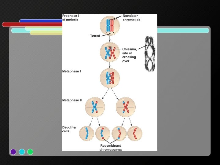 Crossing over • Explains family resemblances • Adds chance for variety in offspring • Mixing genetic material between non-sister chromatids occurs when chromosomes intertwine and break • Tips of two chromatids are switched • The place where the two connect to each other is called a chiasma (pl. chiasmata)