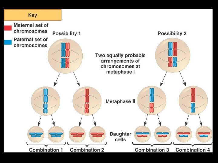 Genetic variety • Generated by: 1. Crossing over during prophase I • Chromatids which were once identical now have different combinations of maternal and paternal alleles at their various loci 2. Random orientation during metaphase I • Bivalents arrange themselves independent of chromosomes from same parent