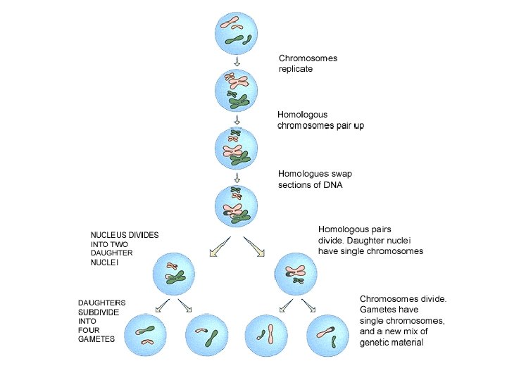 Meiosis • Form of cell division which results in gametes (sex cells) • Each new cell has only half the number of chromosomes that a typical cell in that organism has • These cells are haploid • Cells with the full number are called diploid cells • Division is called a reduction division because the number of chromosomes has been reduced • Four cells are formed and are called daughter cells • Each haploid daughter cell has a unique mix of half of the genetic information of the parent cell