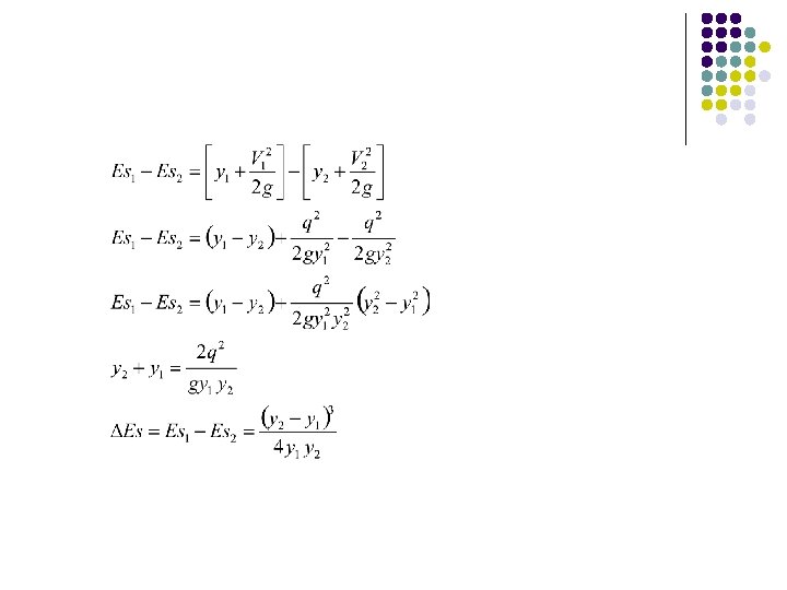 Saluran dengan lebar 6 meter mengalirkan air 20 m 3/det. Tentukan kedalaman air ketika energi spesifik dari aliran minimum. Q = 20 m 3/det b=6 m q = Q/b = 20/6 = 3, 33 m 3/det (permeter lebar aliran) yc= (q 2/g)1/3 = (3, 332/9, 81)1/3 = 1, 04 m