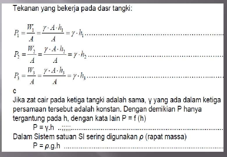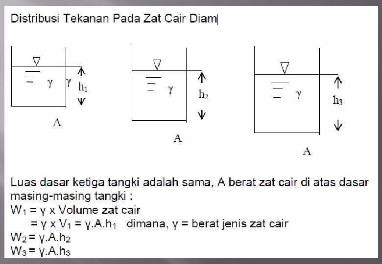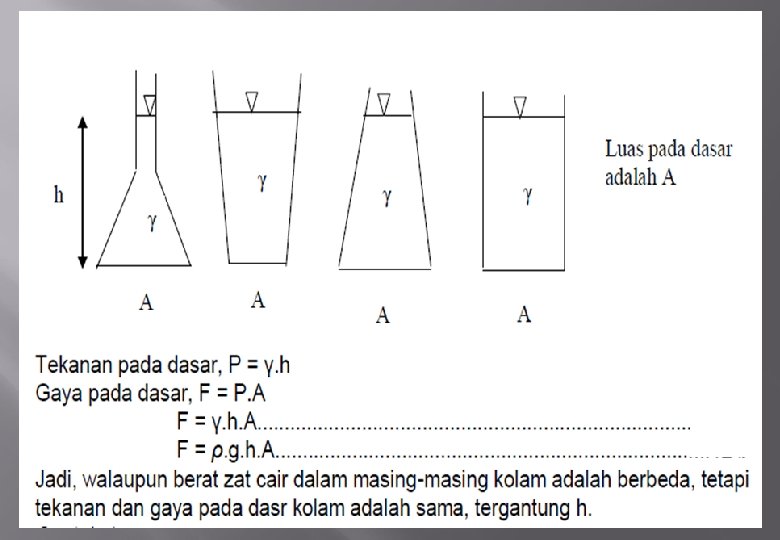 § Hukum Pascal Tekanan yang diberikan pada cairan dalam ruang tertutup akan diteruskan ke setiap bagian dari cairan dindingdinding dari ruang tertutup. Tidak tergantung pada h ke setiap bagian dari cairan