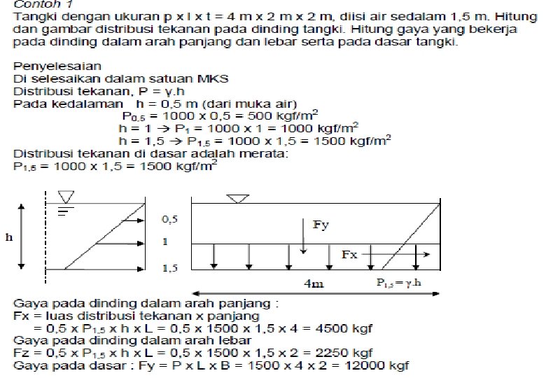 Home work 1. Suatu tangki dengan panjang 2. 5 m, lebar 2 m dan tinggi 2 m, diisi air sampai pada ketinggian 1. 25 m dan sisanya diisi dengan monyak sampai penuh dengan rapat relatif s = 0. 9, tangki tersebut terbuka ke udara luar. Hitunglah dan gambar distribusi tekanan pada dinding dasar tangki dan hitunglah gaya tekanan yang bekerja pada sisi arah panjang dan lebar serta dasar tangki? 2. Suatu tabung berbentuk silinder dengan tinggi t=1. 5 m, A= 5 cm 2 diisi dengna air sampai ketinggian 1 m dan sisanya diisi minyak dengan rapat relatif 0. 9. Tabung tersebut terbuka pada udara luar. Hitunglah : a. Tekanan terukur dan tekanan absolut pada dasar tabung dalam satuan SI. b. Tekanan dalam tinggi air dan minyak.