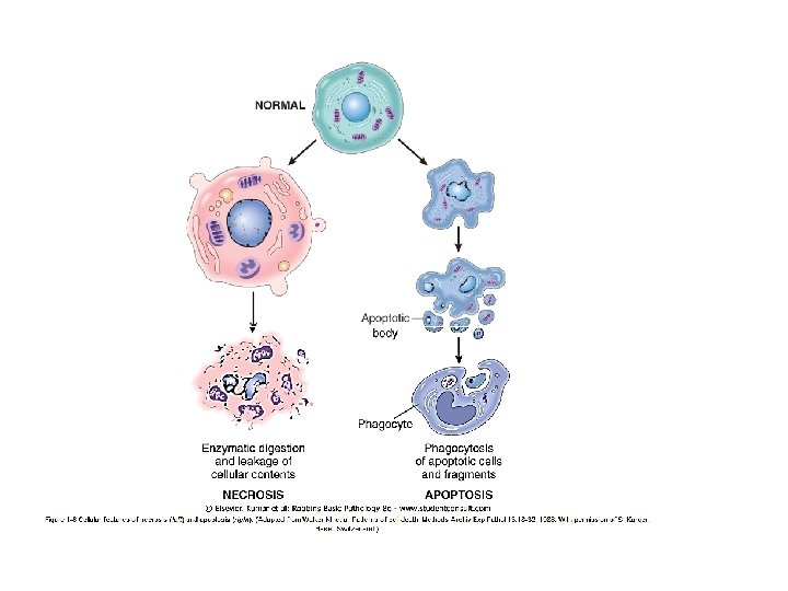 Nekrosis Terjadi kerusakan membran, lisosom mengeluarkan enzim ke sitoplasma dan menghancurkan sel, isi sel keluar dikarenakan kerusakan membran plasma dan mengakibatkan reaksi inflamatori. Nekrosis adalah pathway yang secara umum terjadi pada kematian sel yang diakibatkan oleh: Ischemia Keracunan Infeksi dan Trauma