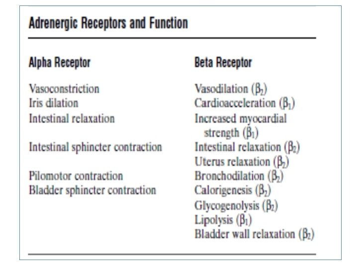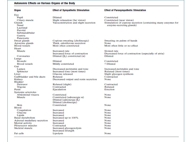 Neurotransmitter Syaraf simpatis dan parasimpatis mensekresikan hanya satu di antara substansi neurotransmiter , asetilkoline atau norepinefrine. Serat yang mensekresikan asetilkoline disebut kolinergik dan serat yang mensekresikan norepinefrine dikenal sebagai adrenergik. Asetilkoline memiliki dua tipe reseptor, yaitu reseptor muskarinik dan nikotinik. Norepinefrine atau adrenaline memiliki dua reseptor yaitu reseptor alpha dan reseptor beta.