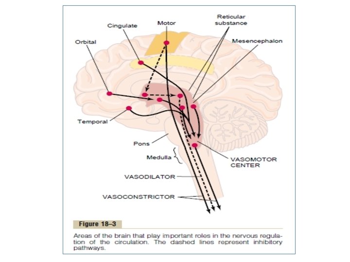Pusat Vasomotor Pusat yang berperan dalam pengaturan impuls simpatis dan parasimpatis pada pembuluh darah Terletak pada substansi retikular pada medulla dan bagian terendah ketiga pada pons. Pada saat yang sama, dimana pusat vasomotor mengontrol konstriksi pembuluh darah, pusat vasomotor juga mengontrol aktivitas jantung