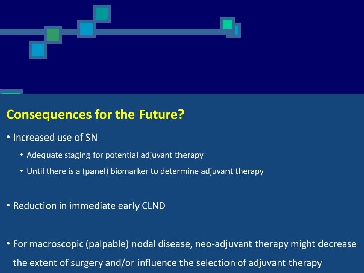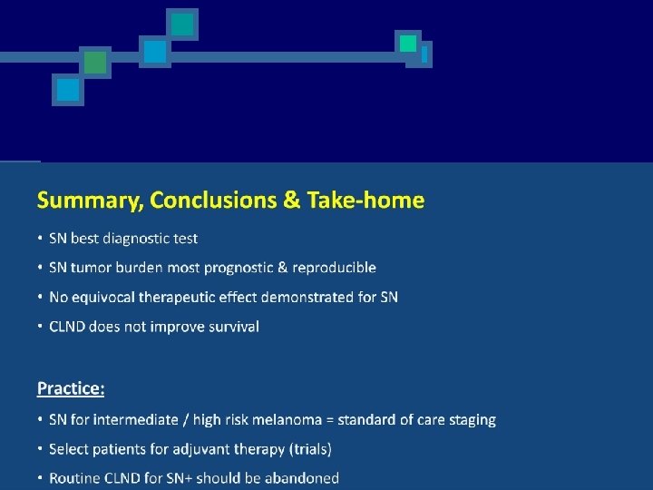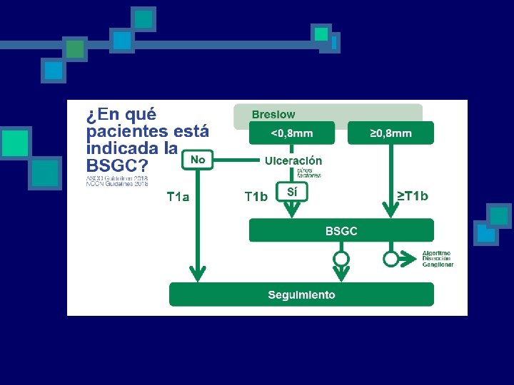 Que hacer en CUBA n n n -Continuar con la introduccion tecnologica del GS. -Si GS positivo evaluar vaciamiento ganglionar en pacientes de grado intermedio y alto de posibilidades de recaida segun tumor primario. -Vaciamiento ganglionar terapeutico en ganglios clinicamente positivos previa biopsia (no se justifica VG por sospecha clinica ni VG electivo)