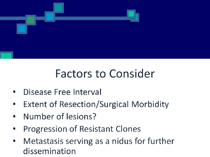 -Disease Free Interval-At least 12 months DFI associated with better outcomes after metastasectomy -Tumour Volume Doubling Time-TVDT longer than 2 months associated with better survival post lung metastasectomy -Medical fitness – good performance status –comorbidities --Detailed anaesthetic assessment to identify patients at low perioperative risk as the optimal candidates for metastasectomy