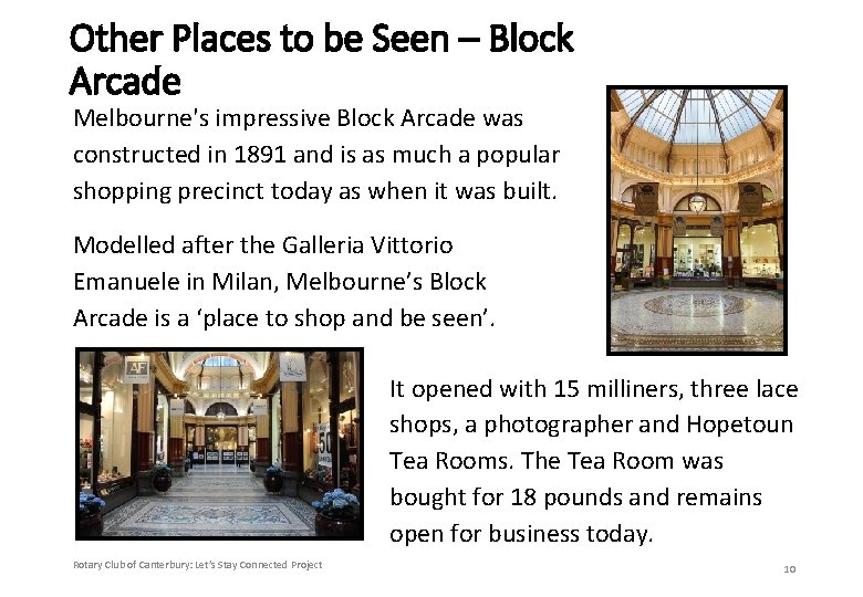 Other Places to be Seen – Block Arcade Melbourne's impressive Block Arcade was constructed in 1891 and is as much a popular shopping precinct today as when it was built. Modelled after the Galleria Vittorio Emanuele in Milan, Melbourne’s Block Arcade is a ‘place to shop and be seen’. It opened with 15 milliners, three lace shops, a photographer and Hopetoun Tea Rooms. The Tea Room was bought for 18 pounds and remains open for business today. Rotary Club of Canterbury: Let’s Stay Connected Project 10