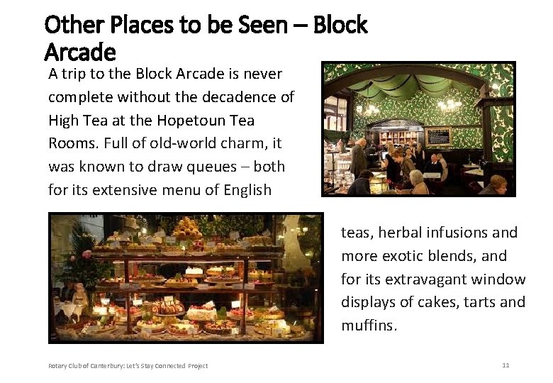 Other Places to be Seen – Block Arcade A trip to the Block Arcade is never complete without the decadence of High Tea at the Hopetoun Tea Rooms. Full of old-world charm, it was known to draw queues – both for its extensive menu of English teas, herbal infusions and more exotic blends, and for its extravagant window displays of cakes, tarts and muffins. Rotary Club of Canterbury: Let’s Stay Connected Project 11