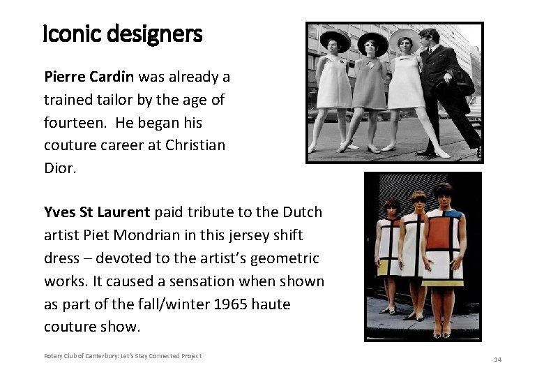 Iconic designers Pierre Cardin was already a trained tailor by the age of fourteen. He began his couture career at Christian Dior. Yves St Laurent paid tribute to the Dutch artist Piet Mondrian in this jersey shift dress – devoted to the artist’s geometric works. It caused a sensation when shown as part of the fall/winter 1965 haute couture show. Rotary Club of Canterbury: Let’s Stay Connected Project 14