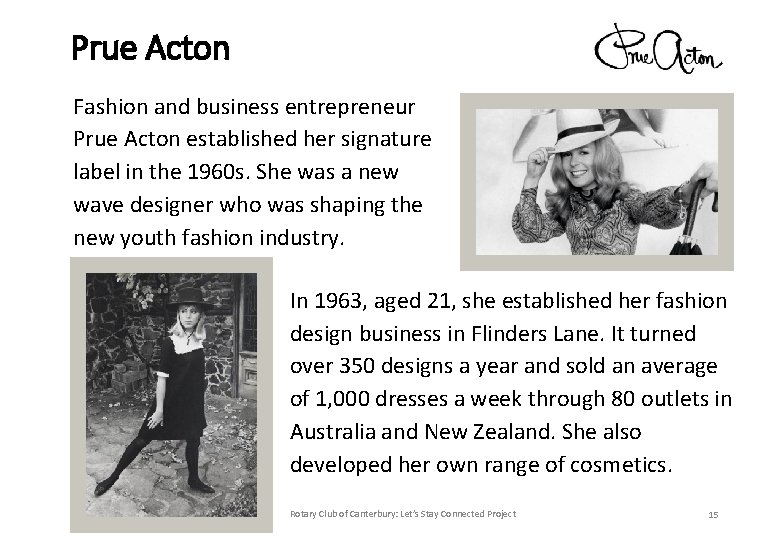 Prue Acton Fashion and business entrepreneur Prue Acton established her signature label in the 1960 s. She was a new wave designer who was shaping the new youth fashion industry. In 1963, aged 21, she established her fashion design business in Flinders Lane. It turned over 350 designs a year and sold an average of 1, 000 dresses a week through 80 outlets in Australia and New Zealand. She also developed her own range of cosmetics. Rotary Club of Canterbury: Let’s Stay Connected Project 15