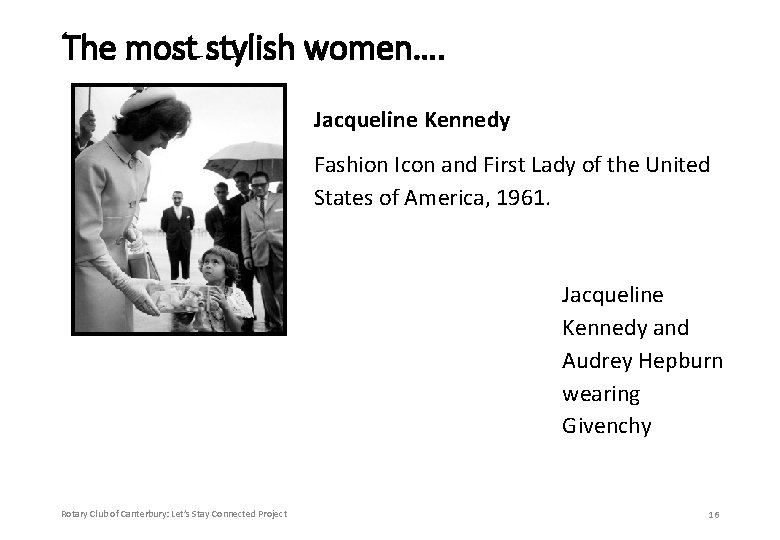 The most stylish women…. Jacqueline Kennedy Fashion Icon and First Lady of the United States of America, 1961. Jacqueline Kennedy and Audrey Hepburn wearing Givenchy Rotary Club of Canterbury: Let’s Stay Connected Project 16