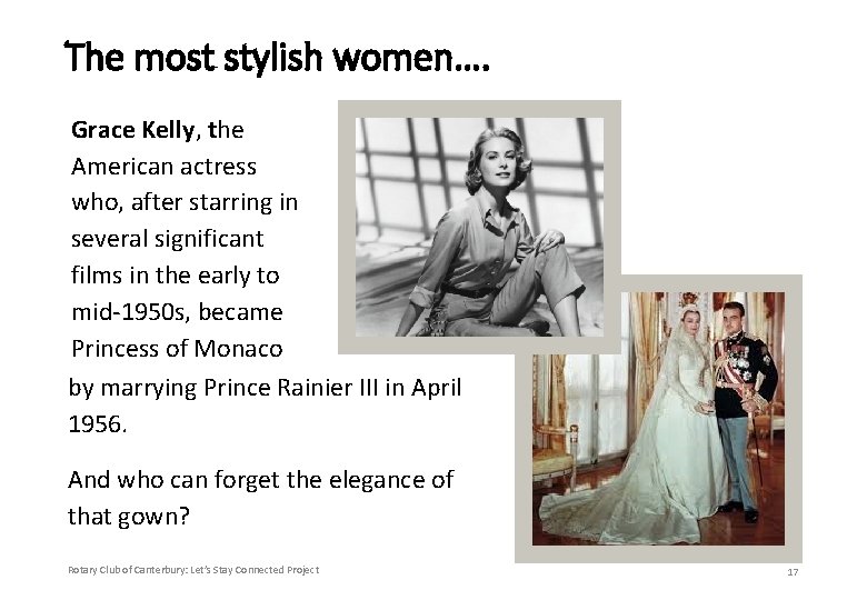 The most stylish women…. Grace Kelly, the American actress who, after starring in several significant films in the early to mid-1950 s, became Princess of Monaco by marrying Prince Rainier III in April 1956. And who can forget the elegance of that gown? Rotary Club of Canterbury: Let’s Stay Connected Project 17