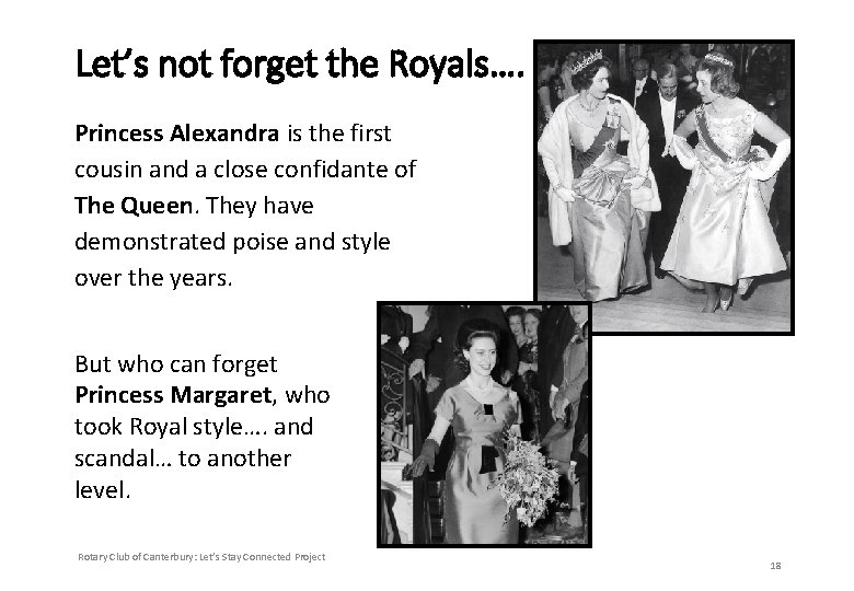 Let’s not forget the Royals…. Princess Alexandra is the first cousin and a close confidante of The Queen. They have demonstrated poise and style over the years. But who can forget Princess Margaret, who took Royal style…. and scandal… to another level. Rotary Club of Canterbury: Let’s Stay Connected Project 18