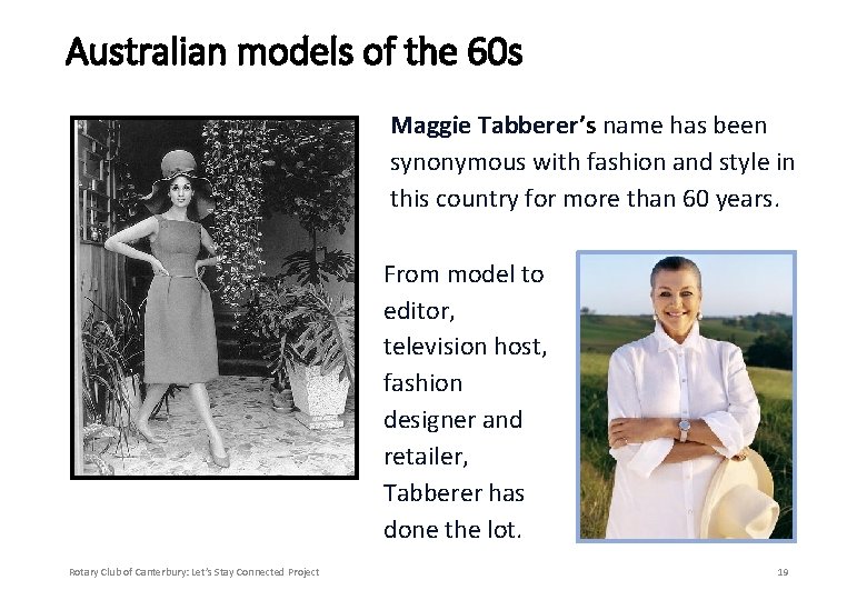 Australian models of the 60 s Maggie Tabberer’s name has been synonymous with fashion and style in this country for more than 60 years. From model to editor, television host, fashion designer and retailer, Tabberer has done the lot. Rotary Club of Canterbury: Let’s Stay Connected Project 19