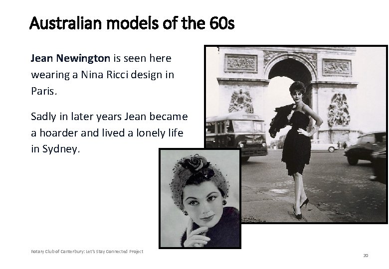 Australian models of the 60 s Jean Newington is seen here wearing a Nina Ricci design in Paris. Sadly in later years Jean became a hoarder and lived a lonely life in Sydney. Rotary Club of Canterbury: Let’s Stay Connected Project 20