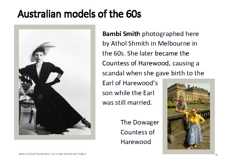 Australian models of the 60 s Bambi Smith photographed here by Athol Shmith in Melbourne in the 60 s. She later became the Countess of Harewood, causing a scandal when she gave birth to the Earl of Harewood’s son while the Earl was still married. The Dowager Countess of Harewood Rotary Club of Canterbury: Let’s Stay Connected Project 21