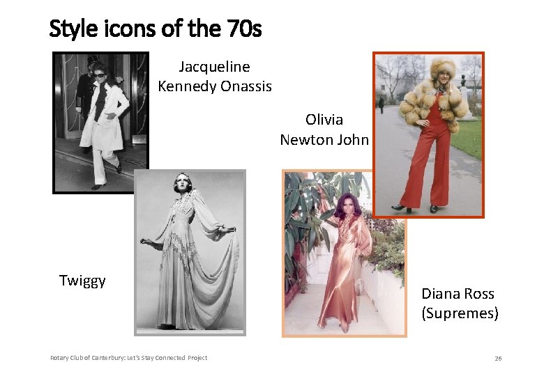 Style icons of the 70 s Jacqueline Kennedy Onassis Olivia Newton John Twiggy Rotary Club of Canterbury: Let’s Stay Connected Project Diana Ross (Supremes) 26