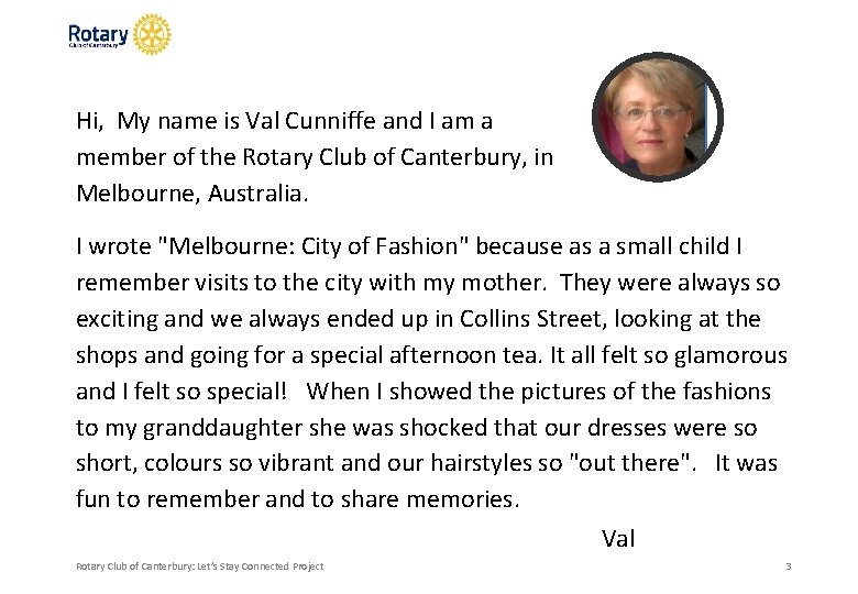 Hi, My name is Val Cunniffe and I am a member of the Rotary Club of Canterbury, in Melbourne, Australia. I wrote "Melbourne: City of Fashion" because as a small child I remember visits to the city with my mother. They were always so exciting and we always ended up in Collins Street, looking at the shops and going for a special afternoon tea. It all felt so glamorous and I felt so special! When I showed the pictures of the fashions to my granddaughter she was shocked that our dresses were so short, colours so vibrant and our hairstyles so "out there". It was fun to remember and to share memories. Val Rotary Club of Canterbury: Let’s Stay Connected Project 3
