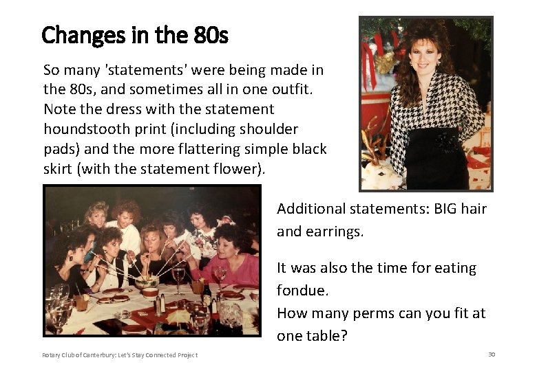 Changes in the 80 s So many 'statements' were being made in the 80 s, and sometimes all in one outfit. Note the dress with the statement houndstooth print (including shoulder pads) and the more flattering simple black skirt (with the statement flower). Additional statements: BIG hair and earrings. It was also the time for eating fondue. How many perms can you fit at one table? Rotary Club of Canterbury: Let’s Stay Connected Project 30