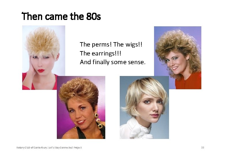 Then came the 80 s The perms! The wigs!! The earrings!!! And finally some sense. Rotary Club of Canterbury: Let’s Stay Connected Project 33