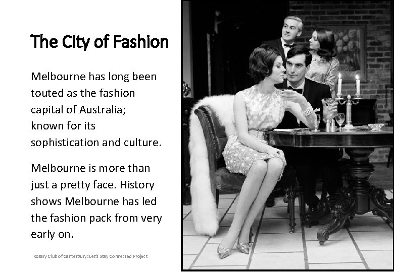 The City of Fashion Melbourne has long been touted as the fashion capital of Australia; known for its sophistication and culture. Melbourne is more than just a pretty face. History shows Melbourne has led the fashion pack from very early on. Rotary Club of Canterbury: Let’s Stay Connected Project 4