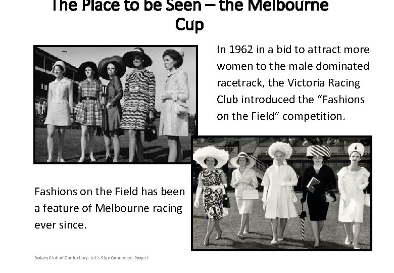 The Place to be Seen – the Melbourne Cup In 1962 in a bid to attract more women to the male dominated racetrack, the Victoria Racing Club introduced the “Fashions on the Field” competition. Fashions on the Field has been a feature of Melbourne racing ever since. Rotary Club of Canterbury: Let’s Stay Connected Project