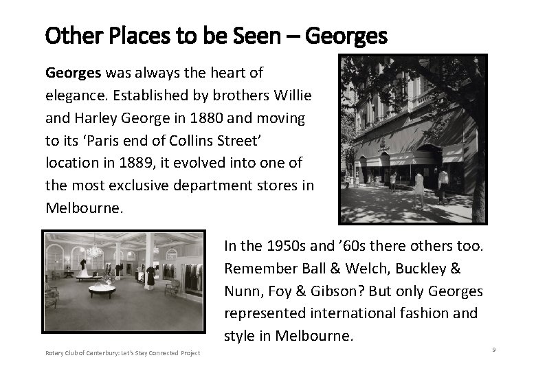 Other Places to be Seen – Georges was always the heart of elegance. Established by brothers Willie and Harley George in 1880 and moving to its ‘Paris end of Collins Street’ location in 1889, it evolved into one of the most exclusive department stores in Melbourne. In the 1950 s and ’ 60 s there others too. Remember Ball & Welch, Buckley & Nunn, Foy & Gibson? But only Georges represented international fashion and style in Melbourne. Rotary Club of Canterbury: Let’s Stay Connected Project 9