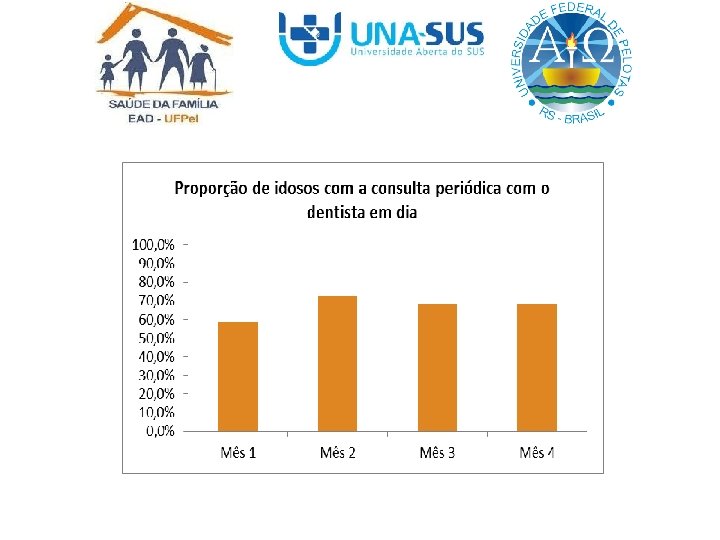 RESULTADOS • 53, 2% dos idosos da área de abrangência com tratamento odontológico concluído. • 86, 3% com avaliação de risco para saúde bucal e prevenção da cárie dentária e orientação nutricional realizada pelo cirurgião dentista.