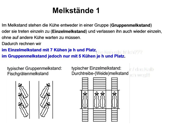 Melkstände 1 Im Melkstand stehen die Kühe entweder in einer Gruppe (Gruppenmelkstand) oder sie treten einzeln zu (Einzelmelkstand) und verlassen ihn auch wieder einzeln, ohne auf andere Kühe warten zu müssen. Dadurch rechnen wir im Einzelmelkstand mit 7 Kühen je h und Platz, Die Kuh gibt Milch? ? ? im Gruppenmelkstand jedoch nur mit 5 Kühen je h und Platz. ………nein, der Bauer / das Kalb nehmen sie ihr einfach weg!!!