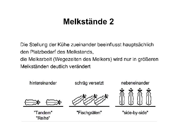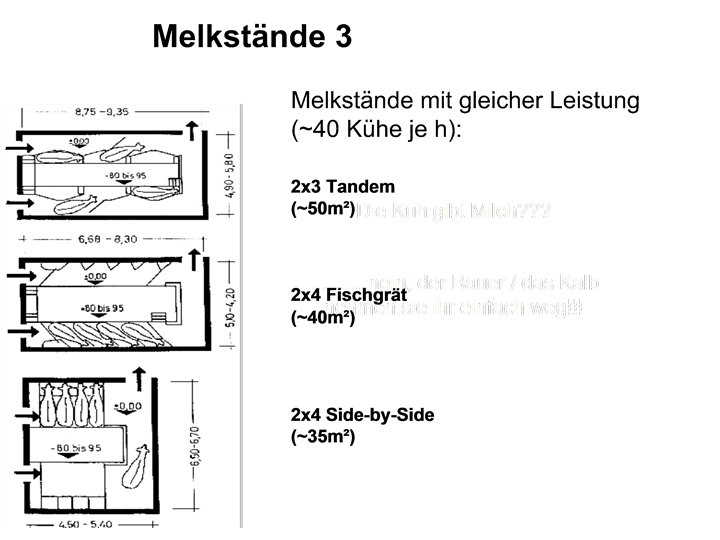 Melkstände 3 Melkstände mit gleicher Leistung (~40 Kühe je h): 2 x 3 Tandem (~50 m²) Die Kuh gibt Milch? ? ? ………nein, der Bauer / das Kalb 2 x 4 Fischgrät nehmen sie ihr einfach weg!!! (~40 m²) 2 x 4 Side-by-Side (~35 m²)