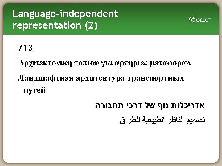 Language-independent representation (1) 713 Landscape architecture of trafficways Arquitectura paisajística de las vías de tráfico Aménagement paysager des voies de communication Landschaftsgestaltung für Verkehrswege Landskapsarkitektur for trafikkårer