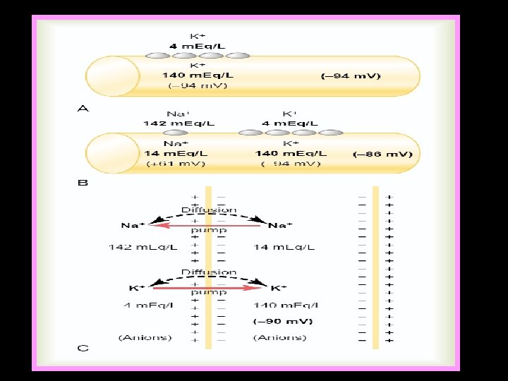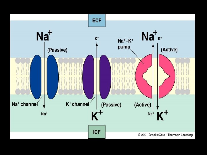 Active transport of sodium and potassium ions through the membrane outside)- 142 m. Eq/L Na+( inside)14 m. Eq/L K+ ( outside)- 4 m. Eq/L Na+( K+( inside)- 140 m. Eq/L Ratio of these two respective ions from inside to outside Na+ = 0. 1 and K+ =35. 0