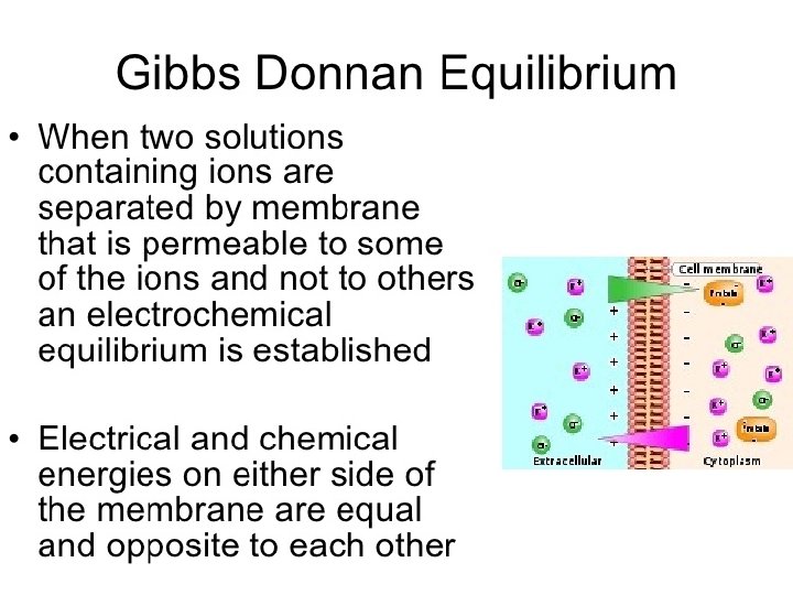 Gibbs Donnan potential • Presence macromolecules negatively charged that cannot escape cause to membrane negative potential • Thermodynamic equilibrium