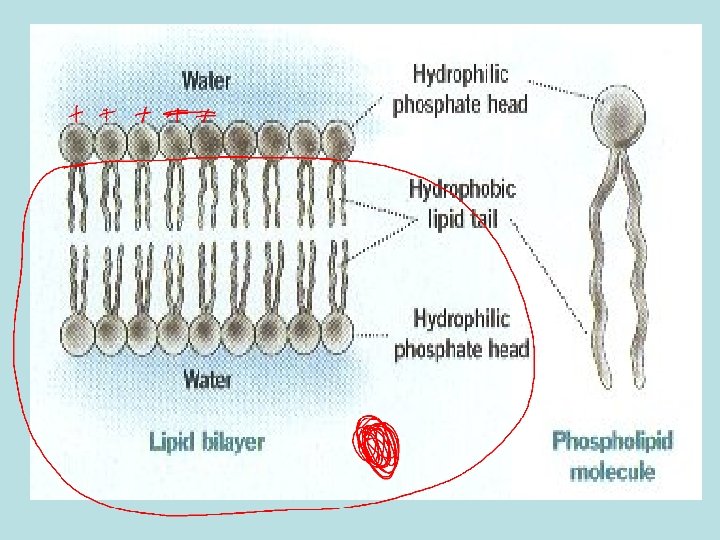 B. Parts: (of plasma membranes and all other organelle membranes) • . Phospholipid molecules and proteins • a. Phospholipids (see Fig. 6. 7 p. 115) – phosphate head (hydrophilic) and 2 fatty acid tails (hydrophobic) (Heads attracted to water, tails repelled by water) 1. ) Membranes – double layer = Phospholipid bilayer - separates 2 watery environments from each other • (ex. Cytoplasm, • exterior envir. )