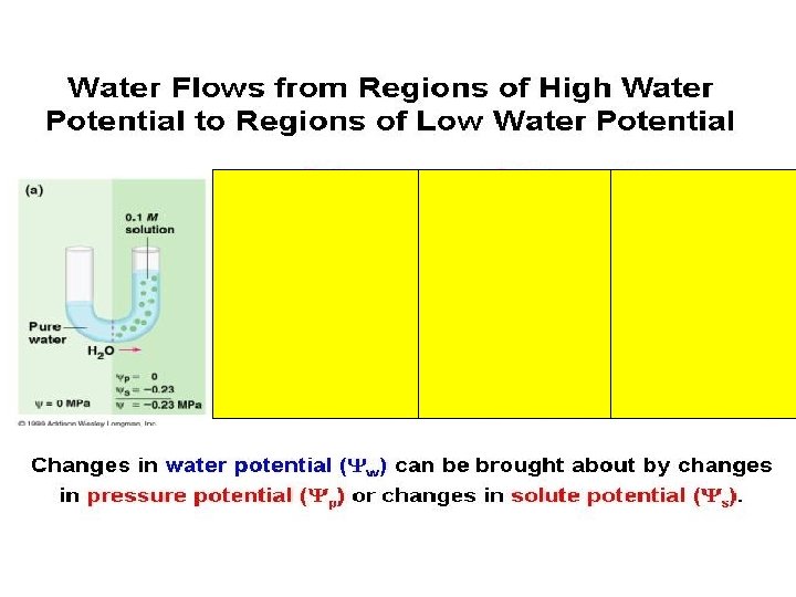 Water Potential Water potential (ψ): H 2 O moves from high ψ low ψ potential Water potential equation: ψ = ψS + ψP • Water potential (ψ) = free energy of water • Solute potential (ψS) = solute concentration (osmotic potential) • Pressure potential (ψP) = physical pressure on solution; turgor pressure (plants) – Pure water: ψP = 0 MPa – Plant cells: ψP = 1 MPa