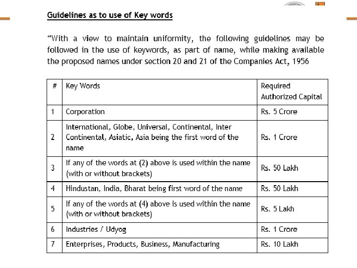 Contents of Memorandum 1. Name Clause: (a) Undesirable name to be avoided. (b) Injunction if identical name is adopted (c) Use of ‘Limited’, ‘Private Limited’ or ‘OPC’ (d) Prohibition of the use of certain names (e) Use of key words according to authorized capital