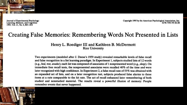 Induzione sperimentale di false memorie (Hyman et al. , 1995) • Veniva chiesto a studenti universitari se ricordavano un evento fittizio insolito (es. rovesciare accidentalmente una caraffa di punch sui genitori della sposa ad un matrimonio) dicendo loro che il fatto si era verificato quando avevano 5 a. • Inizialmente nessuno lo ricordava • Dopo 2 interviste sull’evento, il 25% degli studenti riportava ricordi del fatto o di parte di esso
