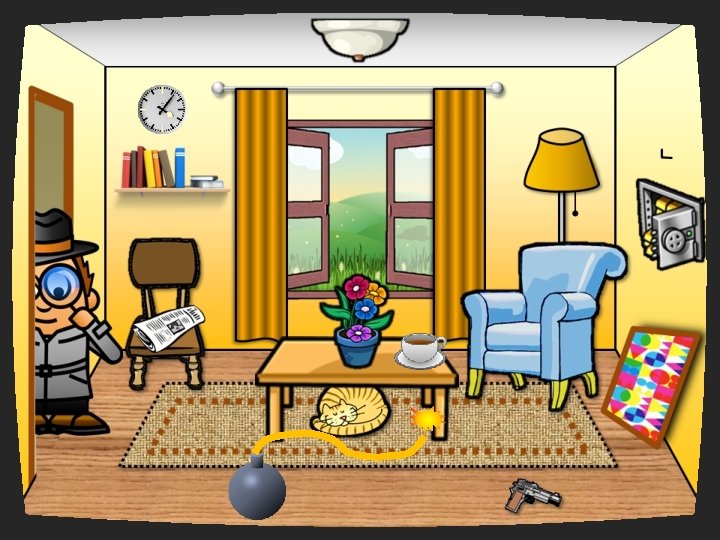 Hi, my name’s Slouth, Johnny Slouth. Mr. Sleuth is back in his office. He is trying to remember the things he saw before a bomb exploded at the crime scene. Can you help him? Look at the picture carefully for 30 seconds. Are the statements true or false?