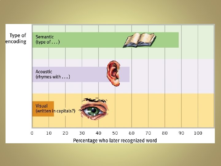 Encoding Processes • Visual Encoding: the encoding of images example • Acoustic Encoding: the encoding of sound • Semantic Encoding: the encoding of meaning ü the most effective ü encoding with multiple process types is even more effective