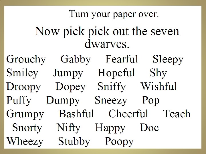 Take out a piece of paper…. . • Name the seven dwarves…. . Now name them…. .