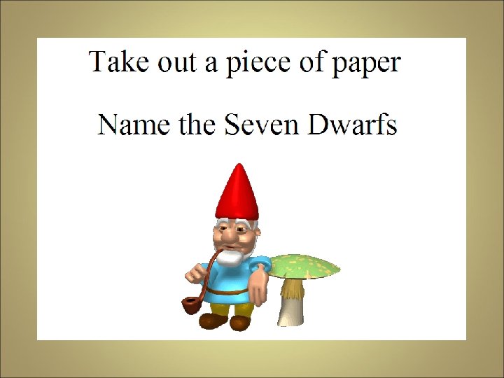 Take out a piece of paper…. . • Name the seven dwarves…. . Now name them…. .