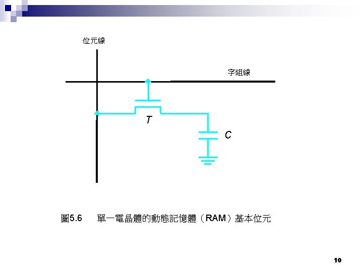 DRAM n DRAM ¨ Dynamic Random Access Memory ¨ Needs 1 transistor and 1 capacitor ¨ Lower cost and compact ¨ Each bit must be refreshed periodically ¨ Implementation technology n CMOS ¨ Construct Main Memory 9